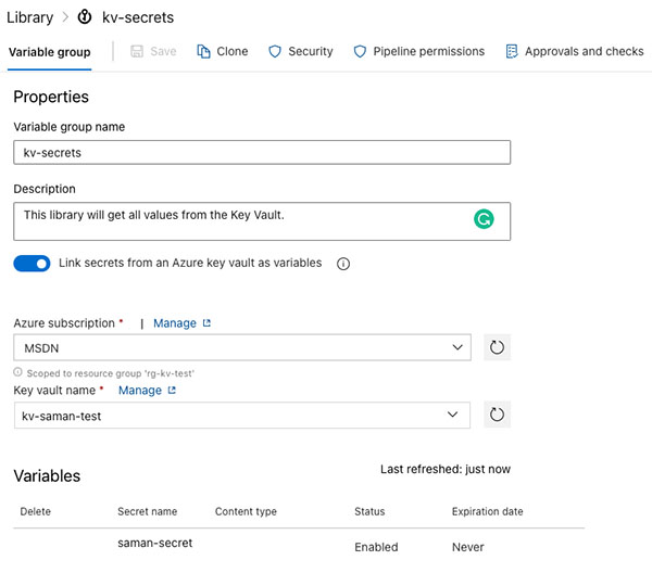 By using this approach, you don’t have to manage any variable group, but at the same time, you have no visibility of the available secrets. The visibility of the list of secrets might be a plus if there are corporate policy restrictions.